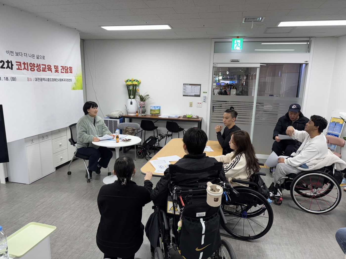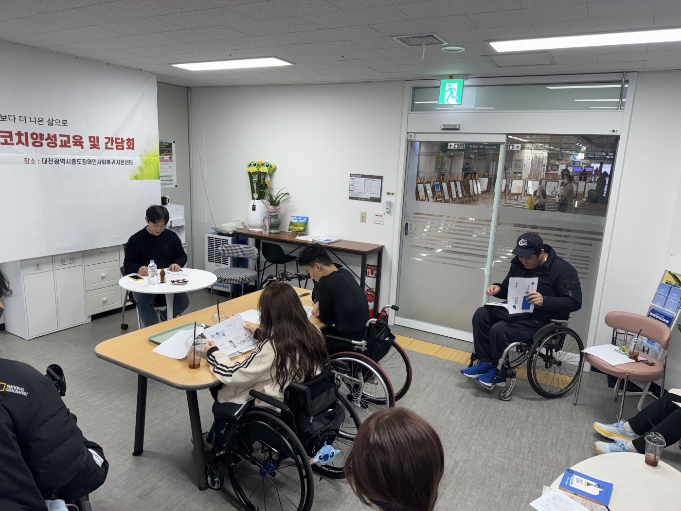 2025년 제2차 코치양성교육 최고관리자 0 3 11.28 11:13 대전광역시중도장애인사회복귀지원센터의 코치양성을 위한 교육이 진행되었습니다.사회복귀홈에 참여하실 훈련생들을 위해 교육이 있었습니다. 그리고 코치양성 교육을 비롯하여 보조기기에 관한 내용과 장애인 건강권법 등에 대해 강의를 진행하였습니다.이번 교육을 통해 참여자들의 자립과 회복에 든든한 디딤돌이 되었길 바랍니다.